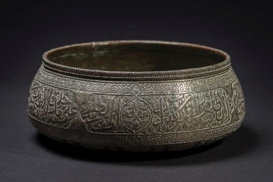 A Middle Eastern silver inlaid brass bowl: of squat form with everted rim, the silver exterior finely engraved with a band of calligraphy in thuluth script including 'glory to our Lord Sultan King al-Nasir' and 'Nasir [victorious] in the world and in the Din', flowers and foliage separated by foliate cartouches and endless knot bands, Egypt or Syria, probably 18th/19th century, 23 cm wide.