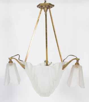 An Art Deco period chrome and gilded three branch electrolier: having a triangular tapering central opaque glass shade signed Degume. with three similar shades to the swept branches, 89cm. high.