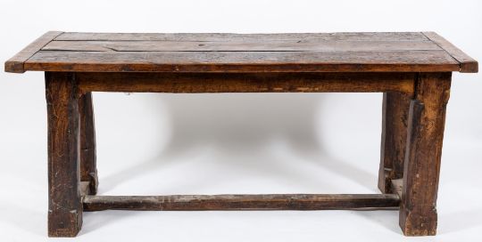 An oak dining table of refectory type in the 17th Century taste:, with a triple plank top on square chamfered legs, united by an H-stretcher, the top 183cm (6ft) x 72cm (2ft 4 1/2in).