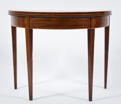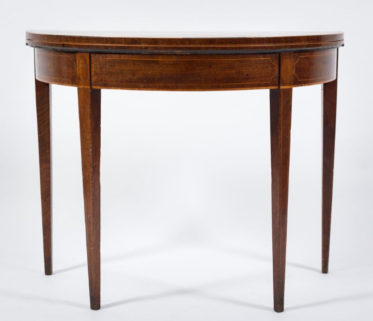 A George III mahogany and inlaid half round tea table:, bordered with boxwood lines, the hinged top on square tapered legs, 86.5cm (2ft 10in) across. * Provenance Rockbeare Manor, Exeter, Devon.