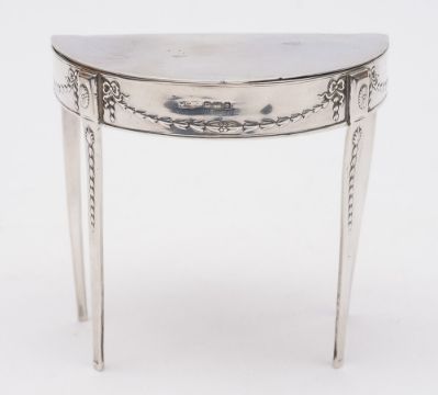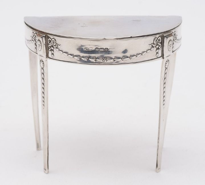 A George V silver novelty ring casket, maker Maple & Co, Sheffield, 1911: in the form of a demi-lune table with hinged lid, and husk decorated frieze, raised on four tapering legs, 10cm. wide, 4.43ozs.