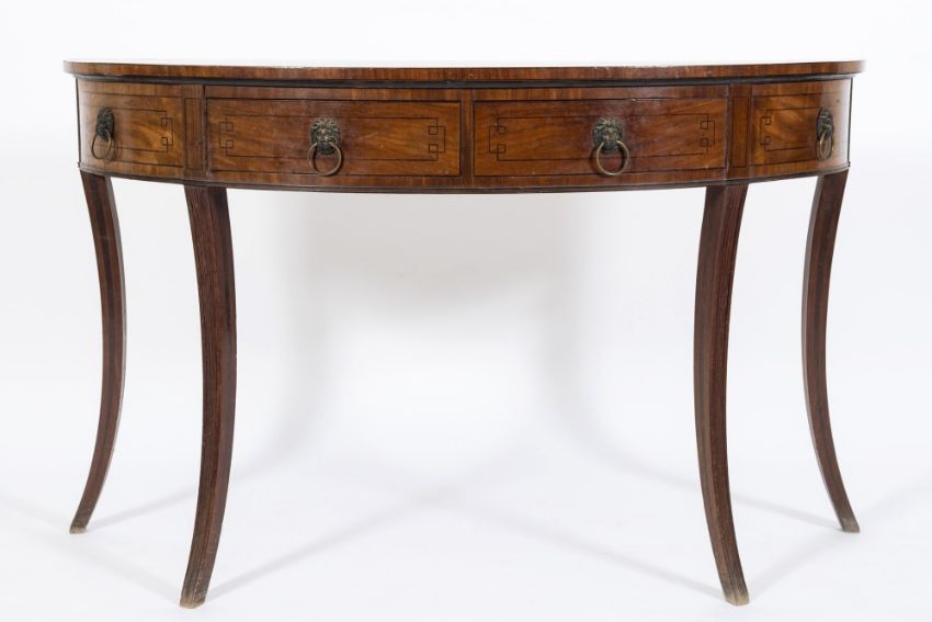 A Regency mahogany and inlaid demi lune pier table:, bordered with ebonised lines, having a curved back and fitted with two central frieze drawers flanked by two dummy drawers with applied brass lions mask and ring handles, on ebonised inlaid reeded sabre legs, 135.5cm (4ft 5 1/4in) across. *Provenance Rockbeare Manor, Exeter, Devon.