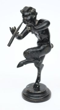 A 19th century bronze figure of a satyr : playing pipes whilst dancing, raised on a socle base, unsigned, 15.5cm. high.