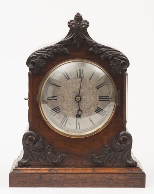 Francis Crichton, a rosewood bracket clock formerly the property of Rear Admiral Sir Roland Jerram: the eight-day duration movement striking on a bell off a single barrel with two wheels attached as described in the patent number 858 of April 1859 as given to Francis Maltby Crichton of Westbury-on-Trim in Gloucestershire, in which 'This Invention consists in a new arrangement of what is usually termed a "going barrel" or toothed spring box, applying the power of one only to work both trains", the backplate engraved Crichton's Patent, the six-inch round silvered dial engraved with floral decoration to the centre, black Roman hour numerals and having blued steel moon hands, the rosewood case having a curved pagoda top with applied carving to the front with further carved mouldings to the lower front and with a stepped base, height 37cm. Complete with copies of the illustrated patent paperwork. * Provenance Formerly the property of Rear-Admiral, Sir Rowland Christopher Jerram, K.B.E, D.S.O, D.L, born 1890, died 1981.