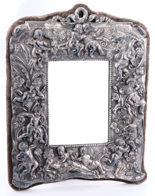 A sterling silver easel mirror, stamped Sterling: decorated overall with cherubs amongst flowering shrubs and trailing foliage, 25 x 20.5cm.