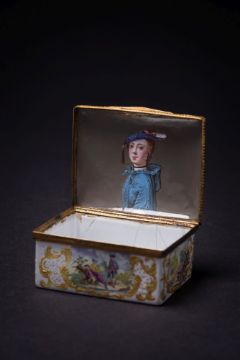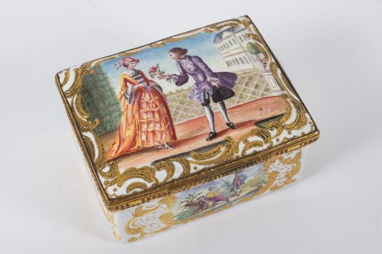 A rare 18th century English enamel rectangular box of Theatrical interest: probably Birmingham, with gilt-metal mounts, the cover decorated with a gentleman presenting a rose to a lady, the sides with figures in romantic landscapes, the base with birds and an overturned basket of fruit, all within rococo gilt borders, the underside of the cover with a portrait of the actress Mrs Brooks wearing a blue coat with a pink rose in her hat, 9 x 7 cm [minor cracks]. *Biography Mrs Brooks was the wife of the engraver John Brooks who was made bankrupt in 1758. To support herself and their three children, Mrs Brooks became an actress. The source of the portrait was a mezzotint by Richard Houston after Thomas Worlidge.