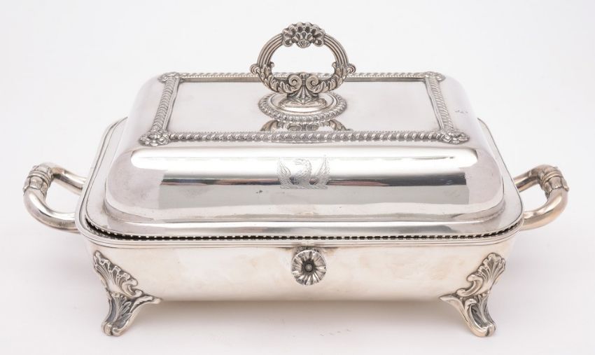 A plated warming dish and cover: crested, with gadrooned borders, reeded loop handle to the cover, having a floral decorated filler cap and raised on foliate decorated swept feet, 39cm. wide.