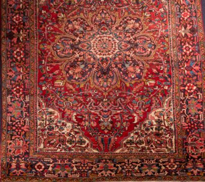 A Persian carpet of Heriz design:, the rose field with a central flowerhead medallion, all over floral designs and ivory spandrels, enclosed by a main indigo floral foliate meander border, 358cm x 256cm.