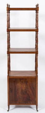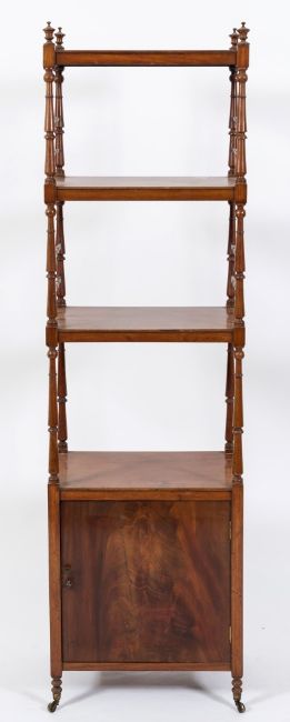 A George III mahogany four-tier whatnot:, with slender turned uprights and sides, having a cupboard at the base enclosed by a door, on turned feet, 171.5cm (5ft 7 1/2in) high. * Provenance Rockbeare Manor, Exeter, Devon.