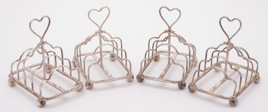 A set of four Edward VII silver four-division toast racks, maker Atkin Brothers, Sheffield, 1903:, of arched outline, with heart shaped handle, on four ball feet, 8 cm long, total weight of silver 3.07 oz.