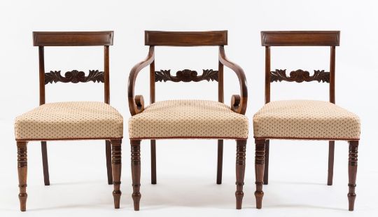 A set of eight late Regency mahogany dining chairs:, the backs with reeded curved bar top rails and horizontal splats carved with scrolling acanthus leaves, having upholstered stuff over seats on ring turned tapered legs - including a pair of elbow chairs, also a pair of Regency mahogany dining chairs with seats upholstered to match (10)