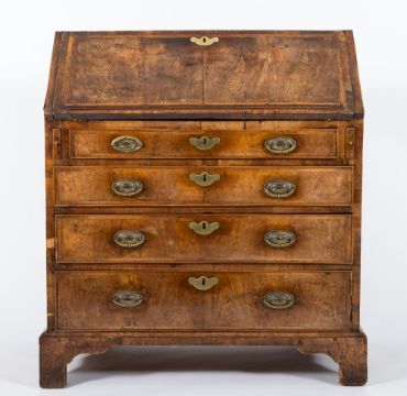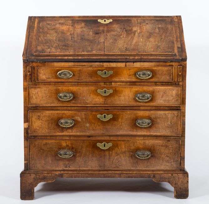 An 18th Century walnut veneer, cross and feather banded bureau:, the sloping hinged fall fitted with a ledge, enclosing a graduated fitted interior with small drawers and pigeon holes about a central enclosed cupboard, containing four long graduated drawers below, on bracket feet, 96cm (3ft 1 3/4in) wide.