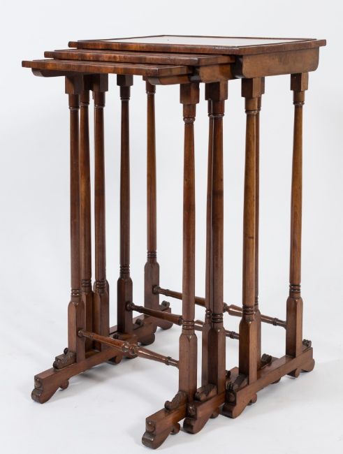 A nest of three early 19th Century mahogany rectangular occasional tables:, the moulded tops on ring turned dual column and trestle end supports carved with foliage, united by ring turned stretchers, terminating in splayed feet.