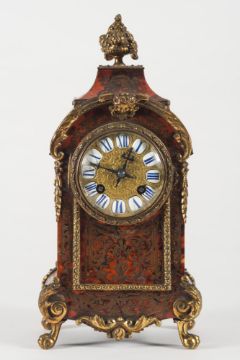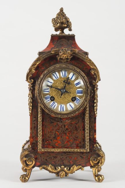 Japy Freres, Paris a Victorian boulle-cased mantel clock: the eight-day duration movement striking the hours and half-hours on a gong, the backplate stamped with the trademark of the maker Japy Freres & Cie, Paris, the round gilt dial with individual white porcelain plaques with blue Roman numerals, with decorative blued steel hands, the boule tortoiseshell case with engraved brass inlay, cast-brass mounts and finial to the pediment and cast feet to the shaped base, height 32cms.