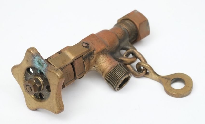 A US Navy control or 'Hoke' valve:, with cog wheel and right angle connections, long stud connection link, stamped 'Made in USA', 18cm long. * see page 185, vol 2, 'Diving Helmets and Equipment Through The Ages'.