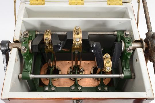 A triple cylinder single action diver's pump by Augustus Siebe, London:, the eccentric crankshaft with numbered con rod bearings, signed to centre con rod as per title, copper jacketed pistons with matching numbers to cylinder tops, tool shelf, in a stained pine case with covered pressure gauge, lifting handles and makers plaque, side air outlet, single flywheel cast 'Siebe' iron handles, the case 81cm x 58cm x 50xm, together with an ash diving pump sedan frame:, with shaped handles and rope shoulder straps:, 175cm x 57cm. *Notes- This pump was shown on BBC television some years ago, being carried across the Scottish Highlands on a donkey cart The party were diving in a Loch inspecting an island which was thought to have been, and was, manmade. * see pages 26-27, vol 2, 'Diving Helmets and Equipment Through The Ages'.