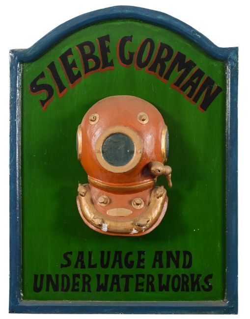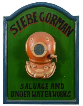 Two hand carved and painted diving helmet advertising boards:, .