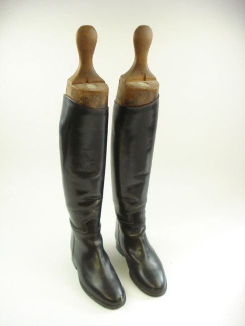 A pair of Tom Hill black leather riding boots with shoe trees, circa 1940:.