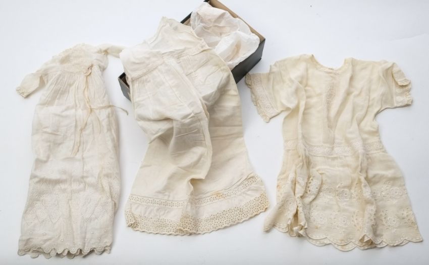 A collection of five early 20th century baby's christening gowns/ white ware:.
