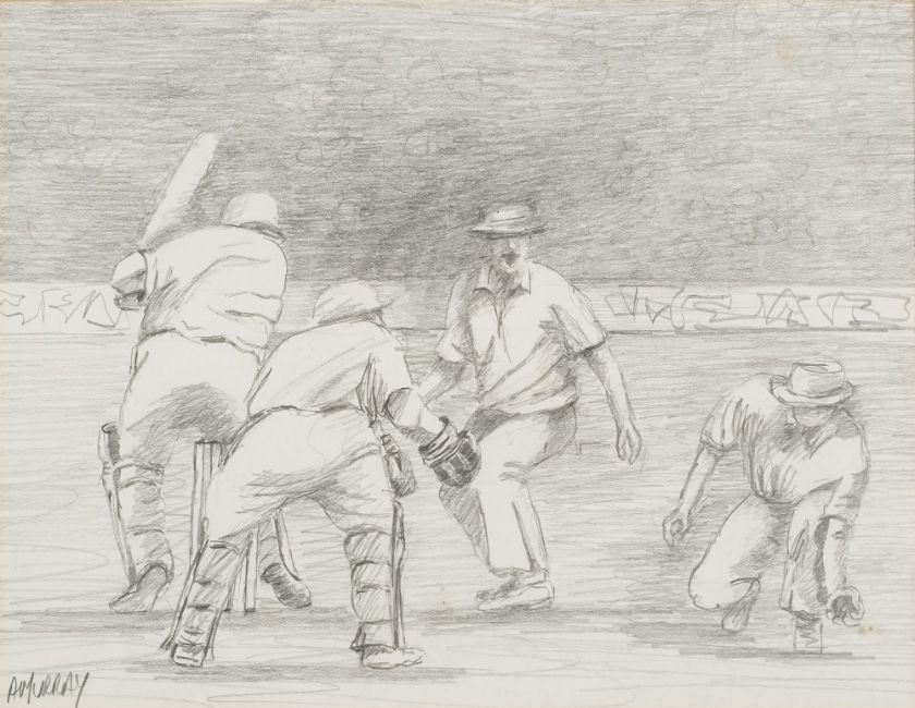 Three pencil sketches of cricket matches, signed A Murray:, 18cm x 22cm.