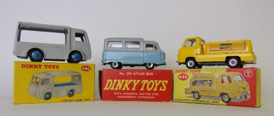 Dinky No 295 Atlas Bus: light blue/grey body, red interior, No 490 Electric Dairy Van, light grey body blue hubs and No 436 Atlas Copco Compressor Lorry, yellow bodywork, all in original boxes, (3).