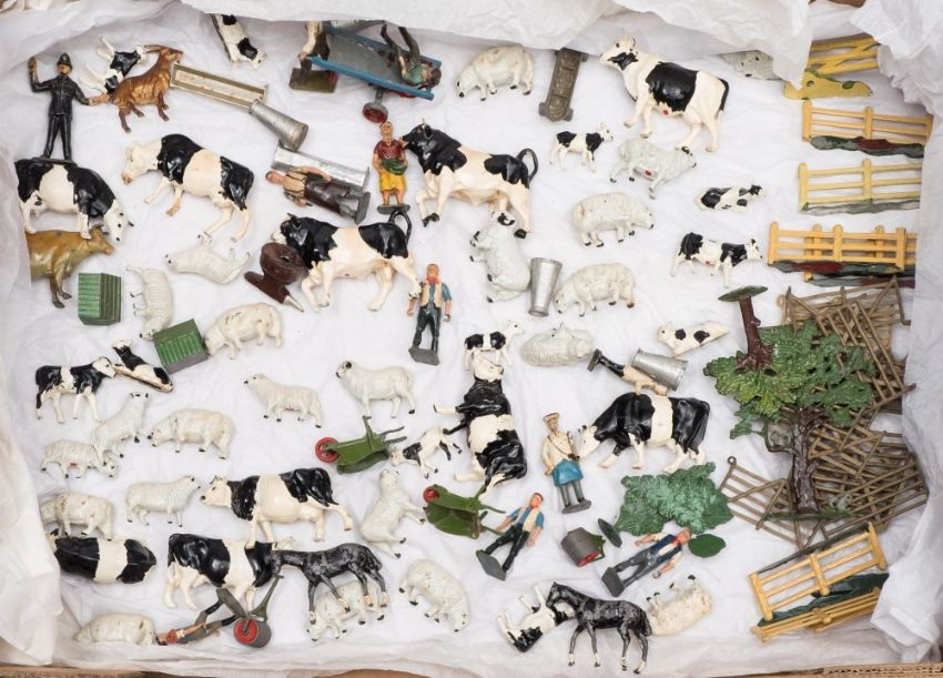 A collection of Britains farm animals and accessories:, including Blacksmith and Anvil, Farmer and Wife, cows, sheep and fencing etc.