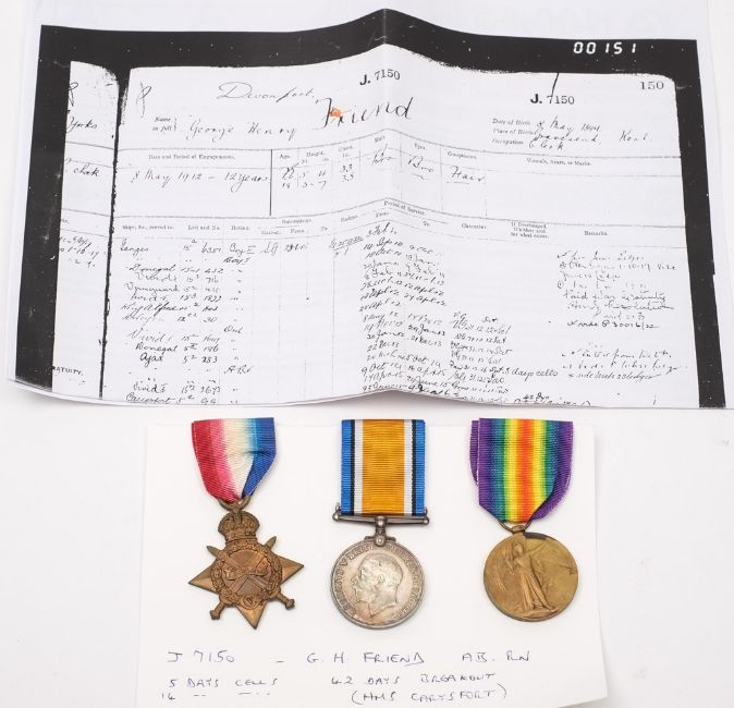 A WWI trio to 'J7150 G H Friend AB RN:, 1914-15 Star, War Medal and Victory Medal.