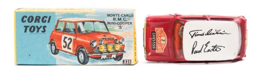 Corgi No.321 Monte Carlo BMC Mini -Cooper S :, in red with white roof and two facsimile signatures, red interior spun wheel and racing number 2 to side, in blue and yellow box with Monte Carlo autograph sticker to box