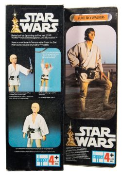 A 1977 issue Star Wars 'Luke Skywalker' 12 inch action figure by Clipper Toys, Amsterdam:, in white tunic with utility belt, fawn trousers and white plastic boots, together with grappling hook and light sabre in original card case with celluloid window, the figure retained on the inner card with packing wire, blue Clipper logo to card, the case 33cm high*Notes- Clipper Toys were the licensee for Kenner in the Netherlands and mainland Europe