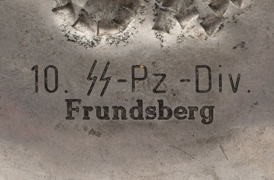 A WWII aluminum trench art bowl for the 10th SS Panzer Division Frundsberg:, with central oak leaf decoration over SS rune, inscribed 'Meine Ehre heisst Treue', also stamped to reverse as per title, 18cm diameter.