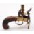 A 19th century boxlock candle tinder pistol:, unsigned, the inverted lyre shaped support with oval powder box and taper holder to one side, scroll engraved action and steel trigger guard on a slab sided mahogany grip, 13cm long.