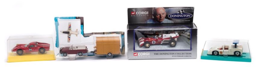 Dinky No 216 Ferrari 246 Dino together with a Marklin 1808 Chaperral in perspex cases:, together with a Corgi Classics Donnington Collection Ferrari 312B2 and a Corgi Juniors James Bond 'Octopussy' E3019 set (lacks card)