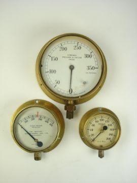 A 7 inch brass bulkhead Combined Pressure and Vacuum gauge by J Tomey & Sons, Birmingham, together with a smaller 'Sentinel' pressure gauge and a 4 inch pressure gauge:, (3)