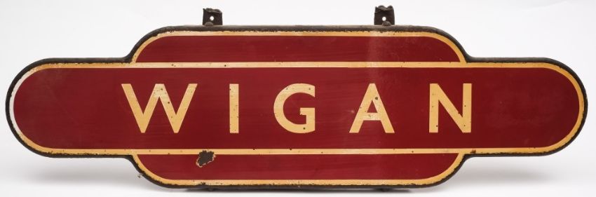 A L&NWR enamel totem for 'Wigan':, in brown and cream with folded edge, iron mounting brackets to reverse, 92cm long..
