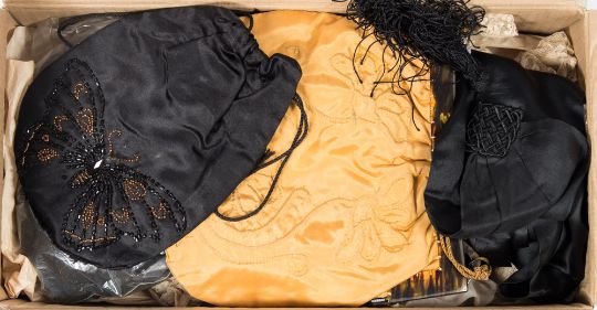 An early 20th century black silk evening scarf, three evening bags and a small collection of lace:.