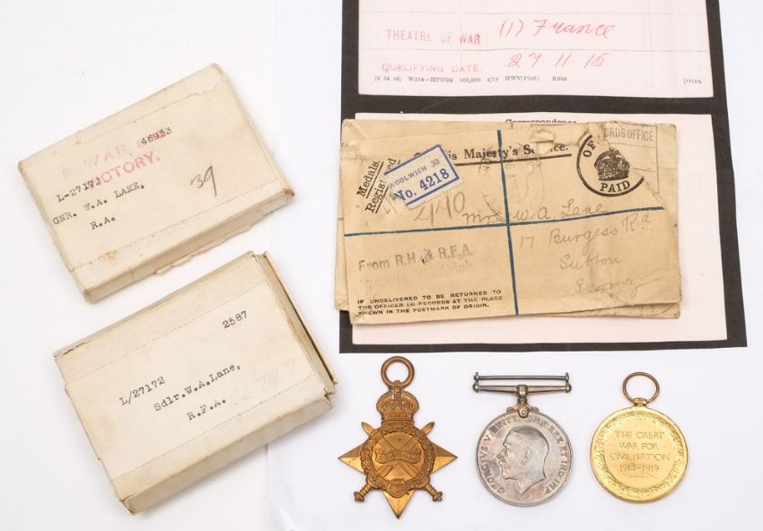 A WWI trio to 'L 27172 Sadler W A Lane RFA', 1914-15 Star, War Medal and Victory Medal:, in issue boxes without ribbons.