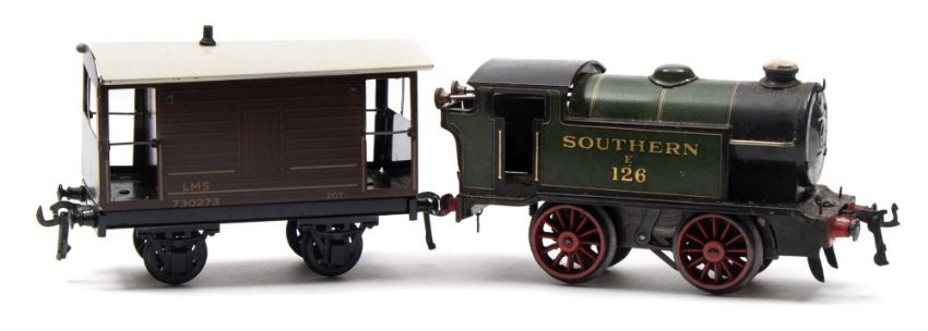 Hornby, an 0-4-0 tank clockwork locomotive No E126 in SR green livery: and a Bassett-Lowke T.P. Goods Brake Van, boxed.