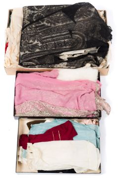 A late 19th/early 20th century black lace and white silk lined shawl, together with seven other various shawls:, including a red cotton example.