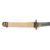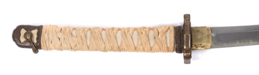 A WWII period Japanese Katana:, unsigned, the blade with single hamon and brass habaki, gilt brass pierced tsuba with chord bound fish skin grip and gilt metal kabuto-gane, in a brown leather military scabbard, label to scabbard 'Japanese Military Sword Trophy from Korea 1950-53', blade length 78cm.