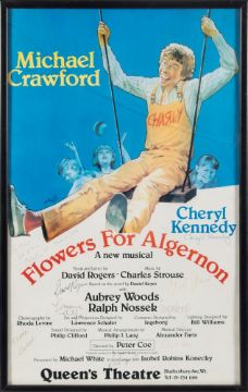 Michael Crawford a signed theatre poster for 'Flowers for Algernon':, dated June 14th 1979, also signed by Cheryl Kennedy and by the choreographer and production team, framed and glazed, 50cm x 31cm.