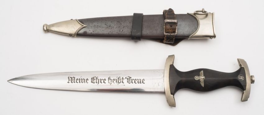A Third Reich period SS dagger by Robert Klaas, Solingen:, the straight double edged blade with inscription to one side, the other with maker's mark as per title, silver plated hilt and ebonised one piece grip inset eagle and swastika with roundel to base, in a black painted scabbard with plated mounts and suspension ring, black leather frog stamped RMZ 1/34, 22cm blade length.17