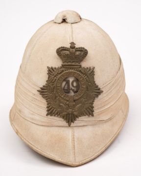 A late Victorian War Department issue pith helmet with Berkshire 49th Regiment of Foot helmet plate:, the helmet with plain interior and leather headband stamped 'WD' and dated 1900, 19cm high.