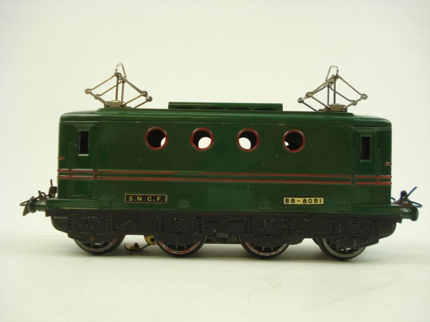 A French Hornby electric 'BB' locomotive in SNCF green with red lining:, 'BB-8051'.