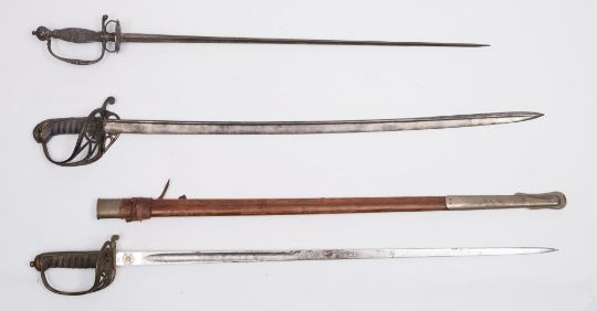A Continental silver-hilted short sword: with 70cm. triangular engraved blade, with figural decorated guard, wire bound grip and embossed pommel, a George V officer's sword, with 82cm. etched and fullered blade with Royal West Kent cypher, brass triple bar hilt with fishskin and wire bound grip, contained in a leather scabbard and a George IV officers sword, (3).