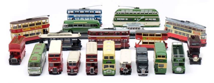 A collection of various trolley buses, coaches and double decker buses:, in various liveries, by Corgi, Oxford and other makers.