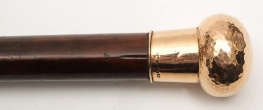 An Edwardian 9ct gold mounted malacca walking cane, maker Johnson, Walker & Tolhurst, London 1908:, the plain shaft with plain gold ferrule with planished pommel, 92.5cm long