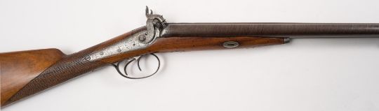 A double barrel percussion cap sporting gun by A Collier:, 29 1/2 inch Damascus barrel, scroll engraved tang, engraved hammers and backlock action signed as per title, steel trigger guard and oval vacant cartouche on a chequered walnut stock, 116cm long.