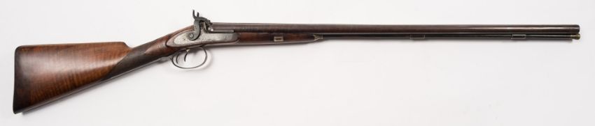 A 12 bore double barrel percussion cap shogun by E London, 51 London Wall, London:, 30 inch Damascus twist barrels signed to rib as per title, signed action engraved with dog and game decoration steel trigger guard and mounts on a chequered walnut stock and fore end, 166cm long.