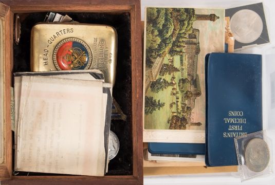 A WWI pair to '156889 GNR Hawkins R A':, together with a brass cigarette case dated 1919, a WWI German Public notice relating to the tampering of telephone lines, and a small collection of related ephemera.