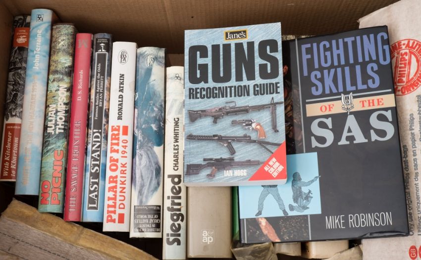 Greener W, W ' The Gun and Its Development', pub. Bath Press 1986:, together with a quantity of gun and militaria books and related subjects (two boxes)